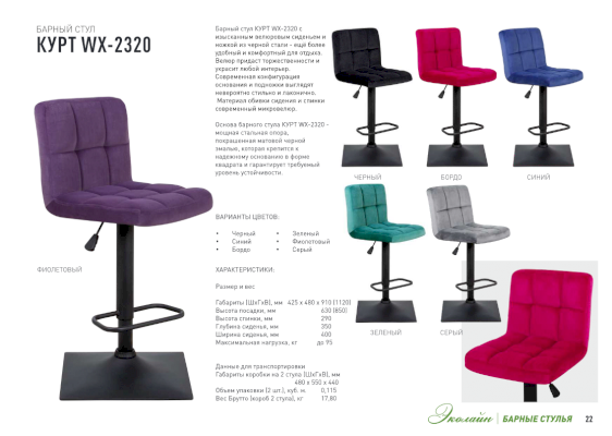Барный стул КУРТ WX-2320 со спинкой непременно придется вам по вкусу и создает в кафе неповторимую атмосферу. Основа барного стула КУРТ WX-2320 - мощная стальная опора, которая крепится к надежному основанию и гарантирует требуемый уровень устойчивости. Мягкие формы сиденья и стеганой спинки обеспечат посетителю комфорт.