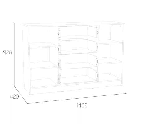 В дизайне тумбы Оливия НМ 040.35 X прослеживается четкая симметрия, которая придает внешнему виду модуля цельность. Тумба центральной части оснащена четырьмя выдвижными ящиками для хранения документов, аксессуаров и мелочей. Справа и слева от ящиков находятся две одинаковые секции с полками для одежды. Полки в сочетании с выдвижными ящиками позволят хранить в тумбе максимум вещей.