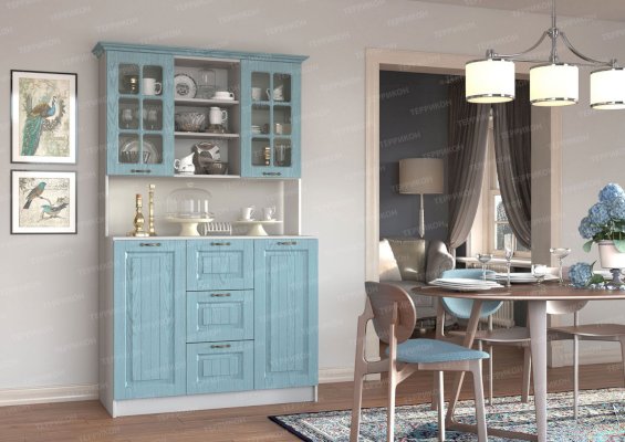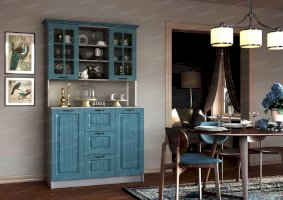 Очарование простой деревенской жизни привносит в дом буфет «Кантри». Отделка нежных холодных оттенков создает атмосферу чистоты и свежести, текстура массива дерева смотрится натурально и дорого. Это очень удобная мебель! В ней предусмотрено место для как нарядных чайных сервизов (на полочках за стеком), так и для обычных кастрюль (в закрытых шкафчиках).