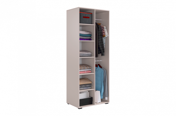 Шкаф оснащён длинными пластиковыми ручками и имеет удобное внутреннее наполнение: слева расположены полки, а справа — две штанги для вешалок. Это позволяет рационально использовать пространство и разместить различные типы одежды.