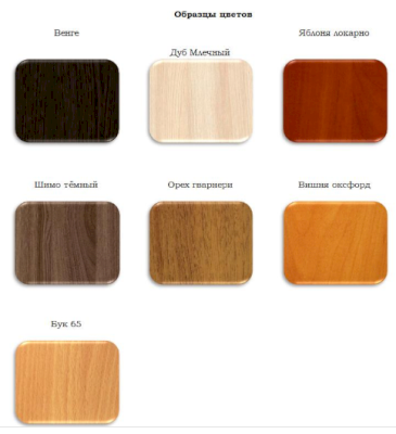 Цвета: Бук, Вишня, Орех гварнери, Итальянский орех, Венге,  Шимо тёмный, Дуб млечный
