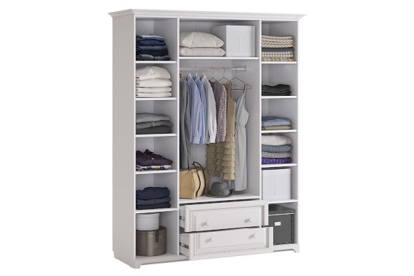Нет ничего лучше, чем сочетание красоты и практичности. 4-створчатый шкаф «Белла» тому доказательство. Фасады шкафа выполнены в нежном оттенке джелато, дверцы украшены фрезеровкой, а ручки – декоративными кистями. Центральный отсек шкафа оснащен круглой штангой для одежды, а боковые – полками. Выдвижные ящики прекрасно подойдут для хранения вещей.